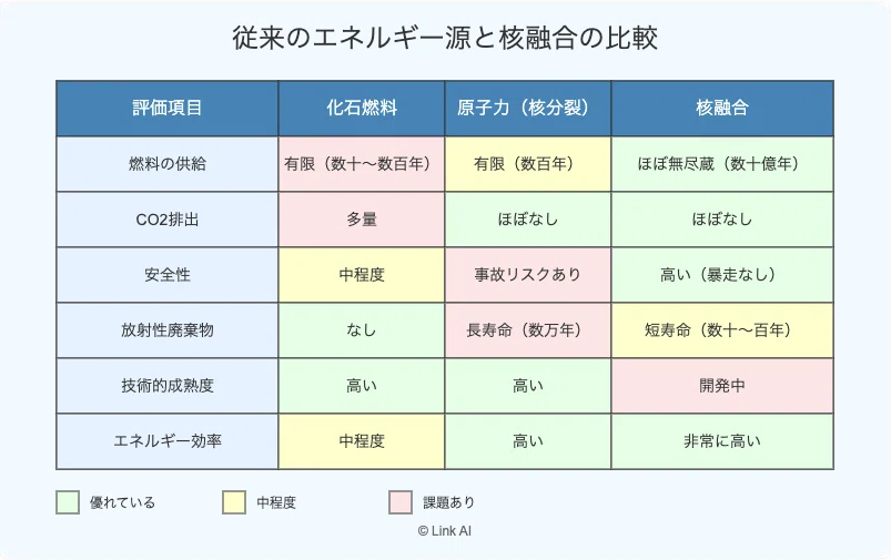 核融合は核分裂に比べて長寿命放射性廃棄物がほとんど出ず(チェルノブイリ型メルトダウンの危険もない)、同質量で4倍以上のエネルギーを得られる利点があります[1][2]。
