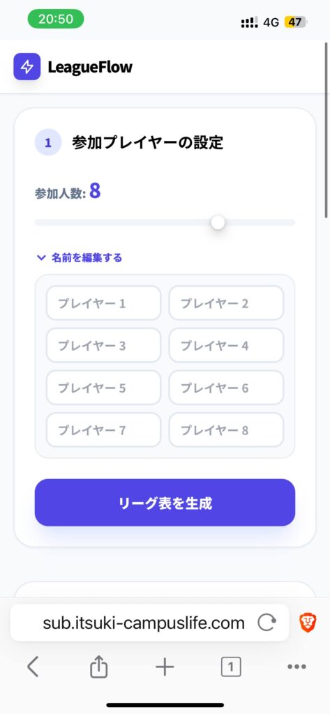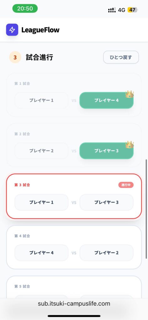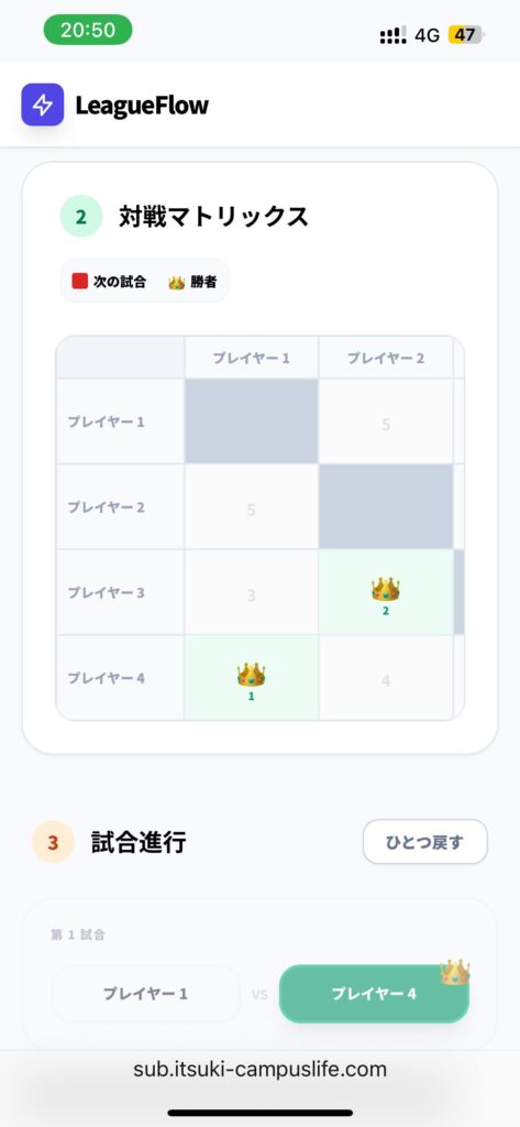 表示順で試合をして勝ち負けを記入すれば、勝手にリーグ表が埋まるようになっています。