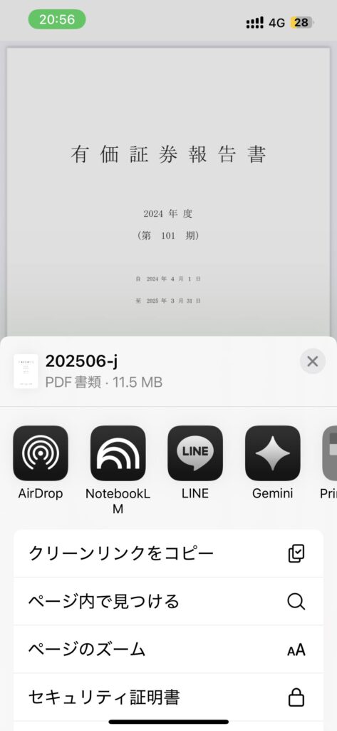 「企業名+有価証券報告書」で開いた有価証券報告書ページで「共有ボタン→NotebookLM」