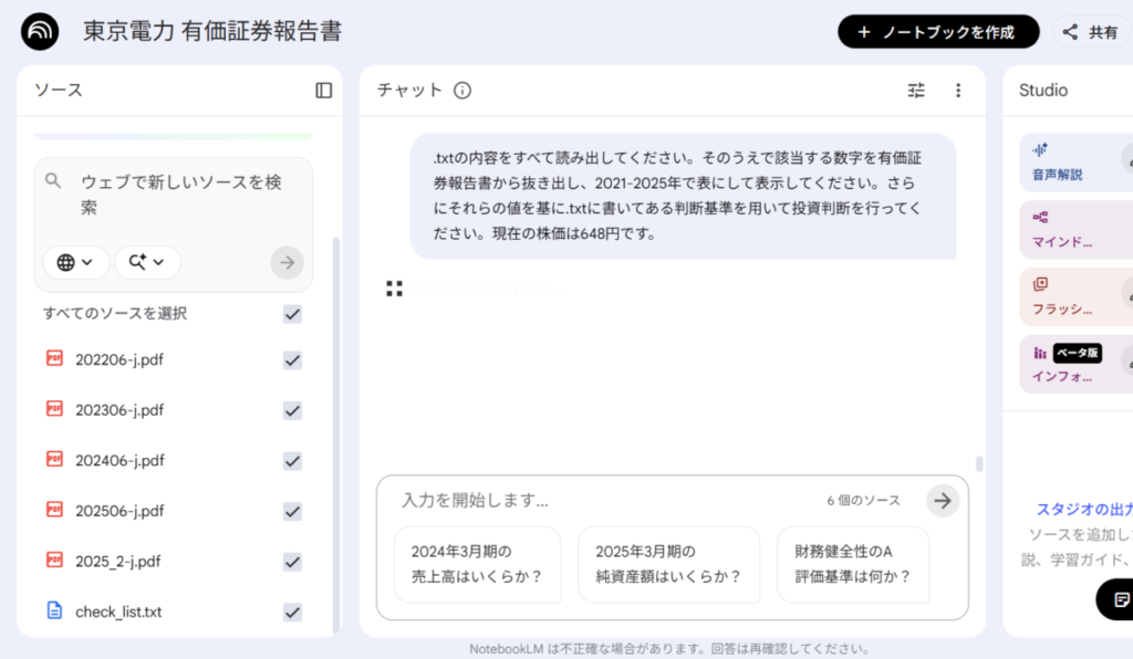 さらにもう一度.txtの内容から投資判断を行わせます。評価基準はChatGPTに作らせました。