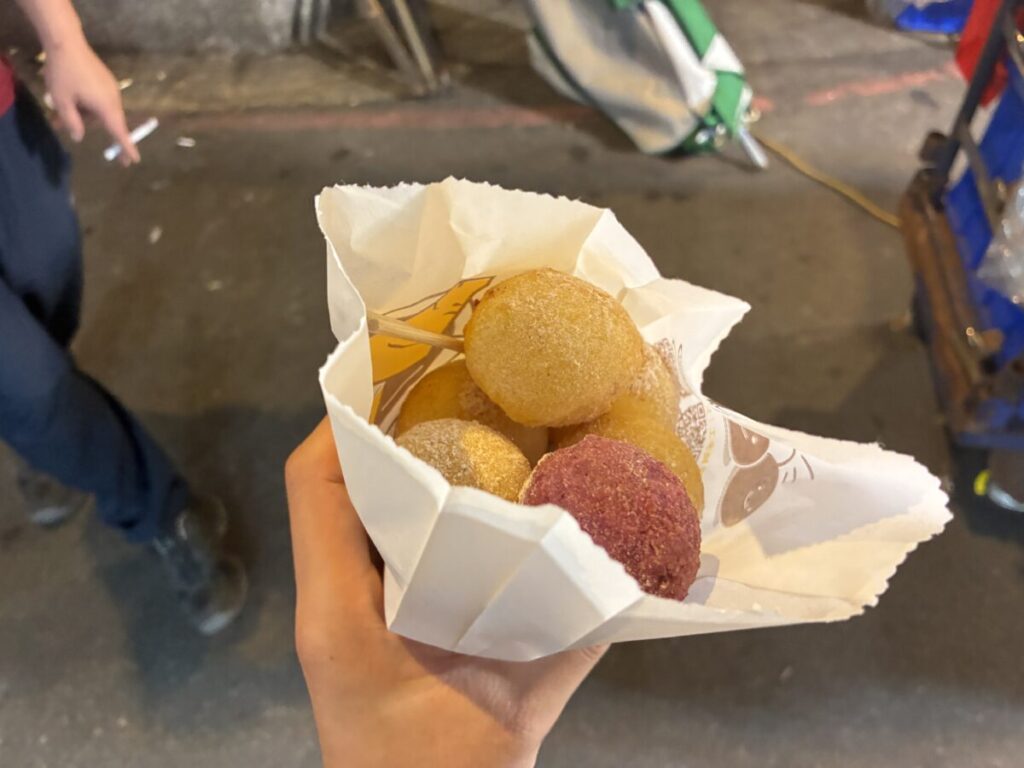 昨日も言った艋舺夜市で「QQボール(地瓜球)」とジーローハン、スープを頼んで食べました。