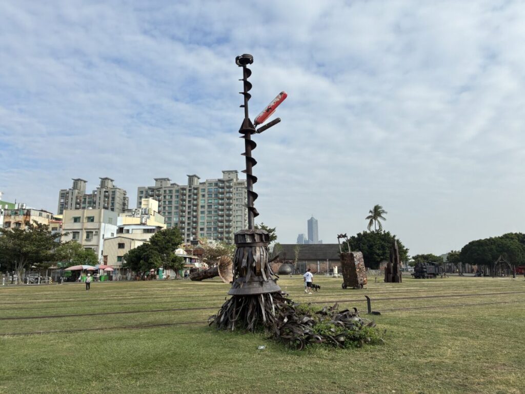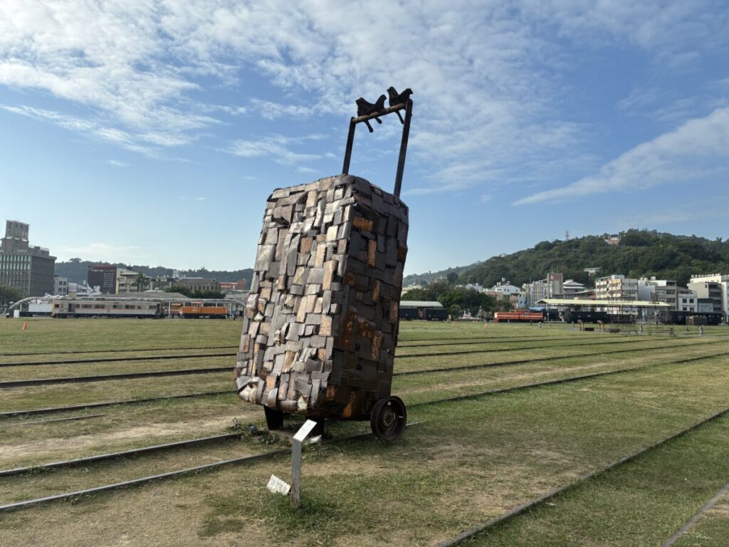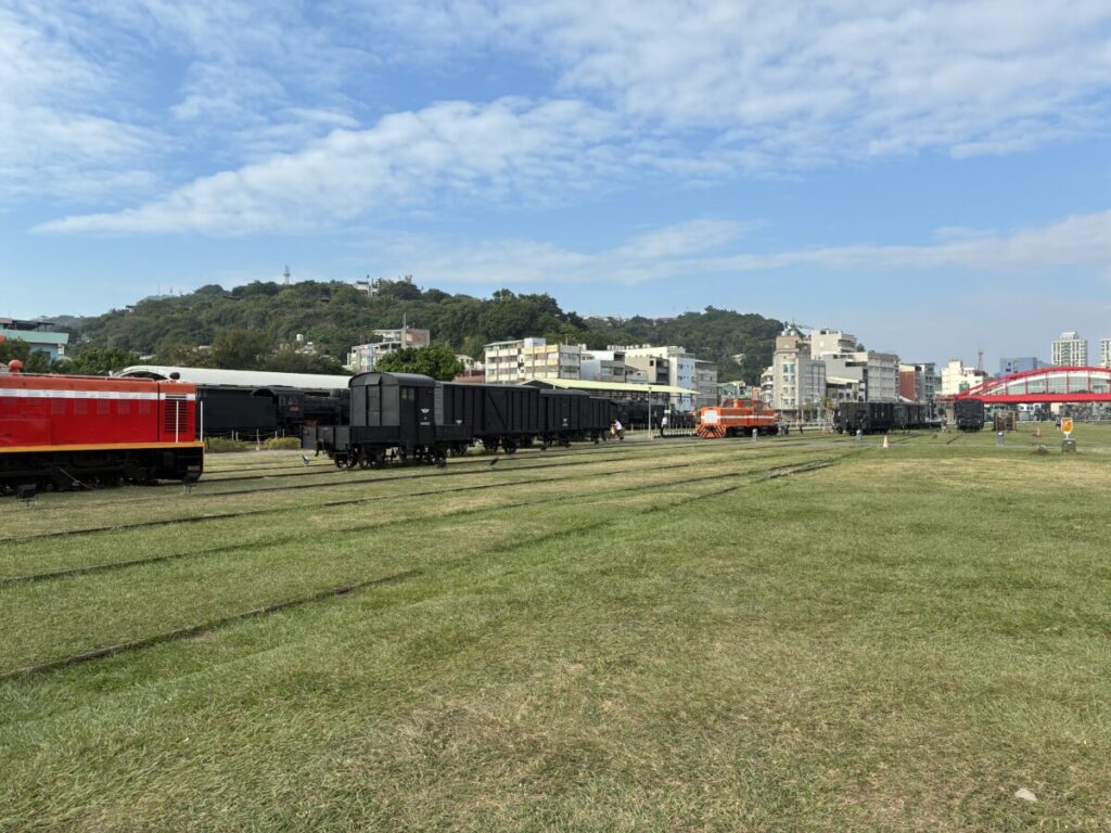 アート特区を見に行こうと到着した駅は、だだっ広い芝生に昔の列車やアート作品が陳列。